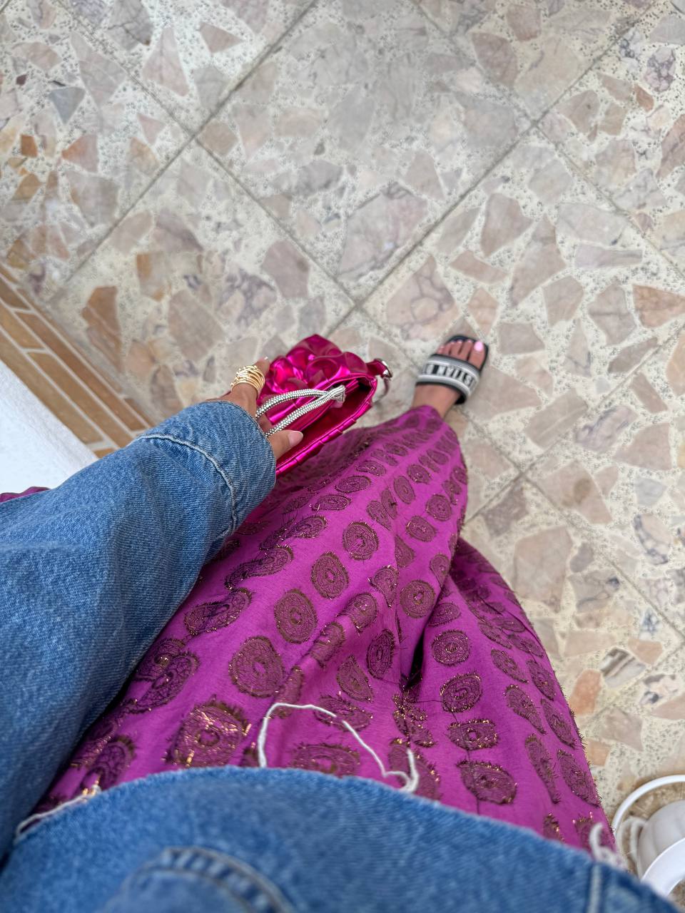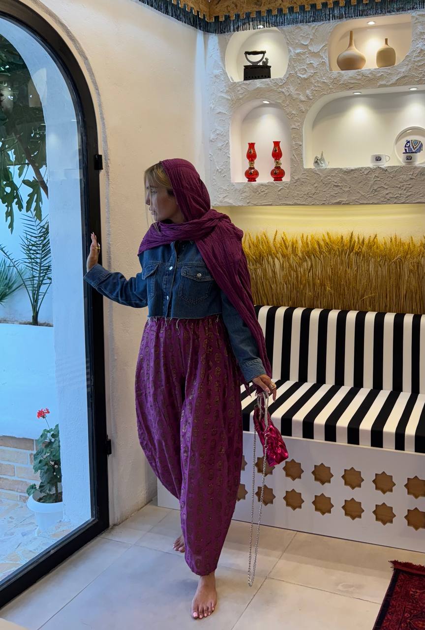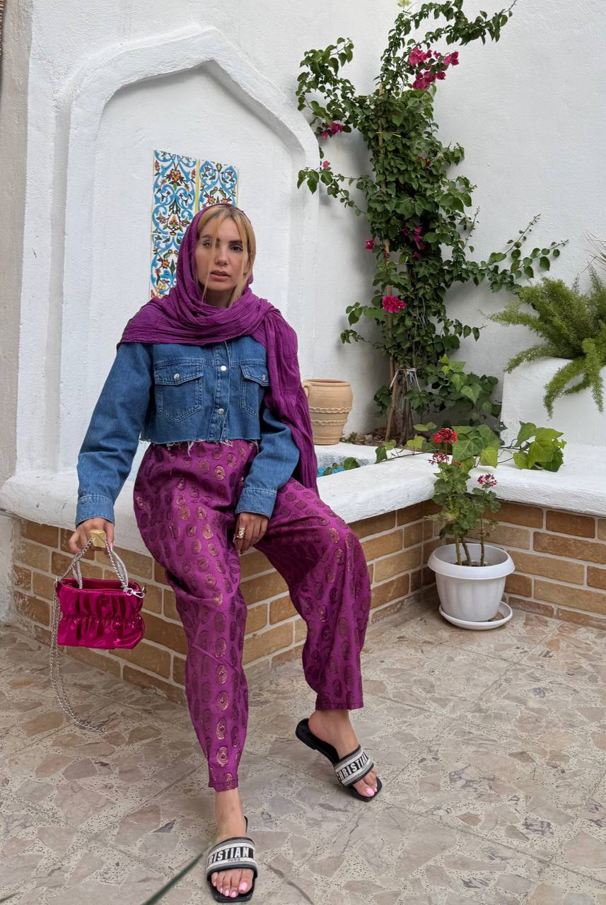 شلوار تبتیپارچه ژاکارد هندیسایز بندیفری سایز 36 تا 42دور باسن120 سانتی متردور ران70 سانتی متررنگبنفشقد شلوار95 سانتی متر